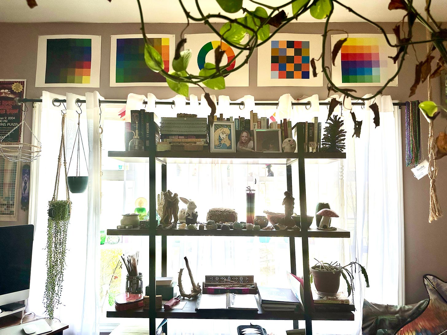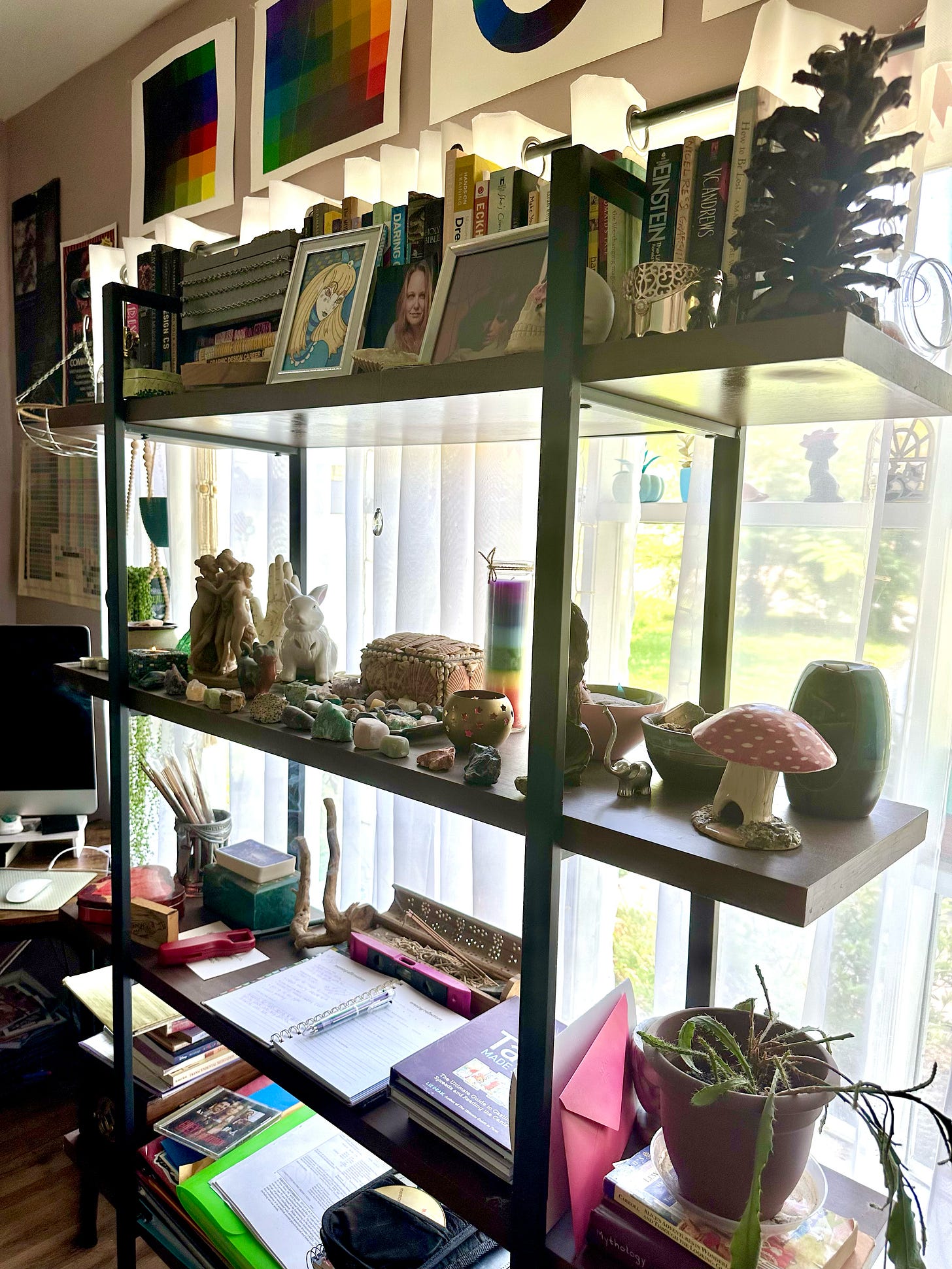 Before things unraveled, I had a rhythm. My spiritual practice was threaded through my daily life — not loud, but steady. My altar spans three shelves of a tall bookcase in my office, layered with meaning: clusters of rocks and objects from nature, white tea lights (burned-out ones gathering in a haphazardly stacked pile), a collection of various incense, a few well-loved plants, and a growing stack of books.