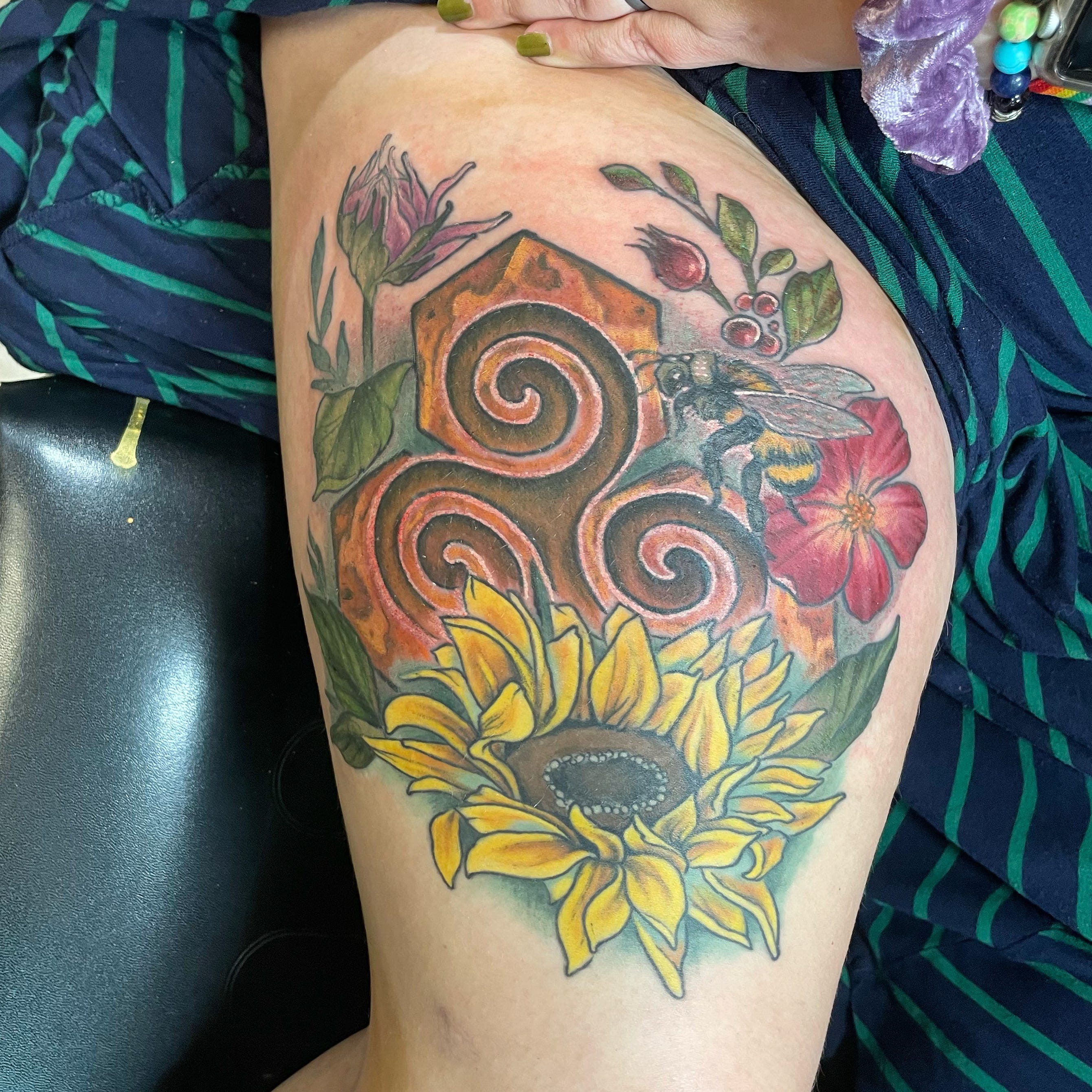 The MorrÃgan, my Celtic goddess of choice, was a big part of my practice — in a statue of the triple goddess, in the crows I saw and served as a mascot for The Sideshow, in the ink that now marks my thigh with Her symbolism. I finished the tattoo during the start of my manic episode in May 2023 — the devotion was real, even if my mind was unraveling.